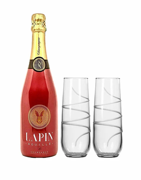 Includes: One (750ml) bottle of Lapin Rouillé Brut and two Rolf Glass Twist Stemless Flutes.